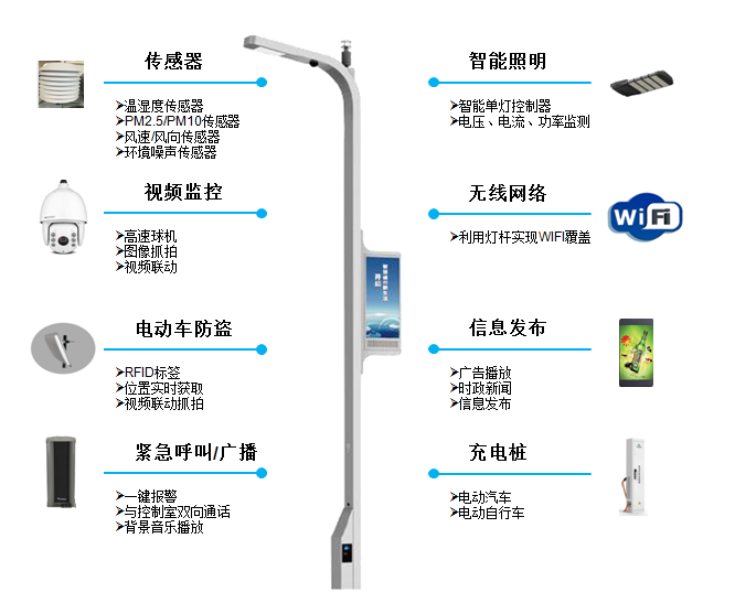 智慧燈桿除了傳統(tǒng)的照明、監(jiān)控功能,還承擔(dān)其他公共服務(wù)功能,包括:智慧照明、智慧安防(視頻監(jiān)控、一鍵報警、公共廣播)、信息交互、無線通信(公共WiFi和4G微基站)、智慧能源(汽車充電樁)、智慧感知(環(huán)境監(jiān)測)、智慧市政(井蓋管理、垃圾桶管理)等,依托強大的綜合管理平臺,智慧路燈實現(xiàn)了智慧城市諸多功能。